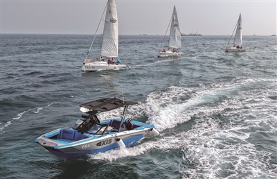 7月10日,山东青岛老龙湾海域,船艇列队参加海上巡游活动(无人机照片)。为迎接中国航海日,青岛市举行“我们来航海”海上巡游活动。市民和游客受邀乘坐帆船、游艇出海,体验海洋文化的魅力。2025年是中国航海日设立20周年,也是郑和下西洋620年。
