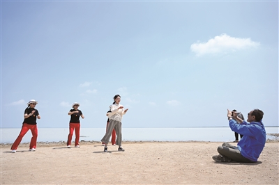 7月11日,游客在内蒙古锡林郭勒盟太仆寺旗白音查干湖边跳舞。盛夏时节,内蒙古锡林郭勒盟太仆寺旗的“牛奶湖”——白音查干湖、石条山等地景色宜人,吸引游客前来赏景游玩。