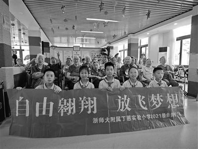 商报讯 (记者 陈敏娜 通讯员 杨晓雯) 7月9日下午,浙师大附属丁蕙实验小学405中队春晖小队的5名队员林周毅、李苒、谢梦烑、蔡诚煜、岳耀龙,带着精心准备的节目走进杭州市第三社会福利院,参与第52期“银龄领读计划”公益活动,用童声与才艺为长者们送去夏日里的精神盛宴。