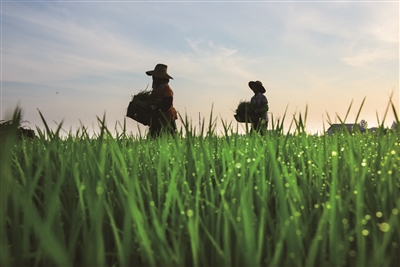 7月15日,在湖南省常德市澧县城头山镇车溪河社区,村民在晚稻秧田转运秧苗。正值“双抢”大忙时节,各地农民抢抓农时翻耕稻田、抢插晚稻。