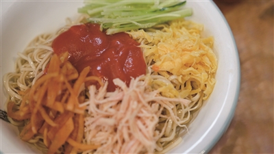 茄汁鸡丝凉面,用的茄汁底,拌进凉面里,酸得更鲜活。茄汁的酸甜裹着有弹性的面条,再配上鸡丝、蛋丝、黄瓜丝和酱萝卜,在嘴里嚼出夏天的清爽。