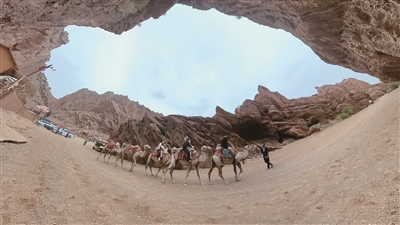 7月17日,游客在新疆独库公路附近的克孜利亚大峡谷骑骆驼游览。独库公路是国道G217线的一段,北起独山子,南至库车,全长约561公里,穿越雪山、草原、峡谷等多种地貌,是一条纵贯天山脊梁的景观大道。进入暑期旅游旺季,独库公路通车量迎来高峰。因山区地形复杂、夏季气候多变,公安交警部门提示游客关注天气预警信息,注意出行安全。