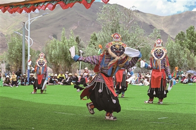 7月16日,民间藏戏表演队在西藏南木林县非遗公园内表演湘巴藏戏。流传于南木林县的湘巴藏戏有着悠久的历史,2006年藏戏被列入第一批国家级非物质文化遗产名录。南木林县积极构建藏戏传承体系。目前,全县共有29支民间藏戏队,876名藏戏从业者,还有1支32名少儿组成的平均年龄9岁的少儿藏戏队。一代代藏戏表演者在表演实践中传承创新。