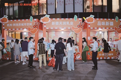 作为“建行717美好生活节”的重要版块——“善助优选”市集也在灯火与晚风中正式启幕。阿克苏城市空间展位前,两位身着艾德莱斯绸的姑娘按着称作“恐龙蛋”的李子,热情吆喝:“尝一口,空运来的!”清甜的味道让路过的陈女士立刻打开“建行生活”,用5折券带走一筐小红杏和一袋牛肉干,“抢到了专项优惠券,太划算!”雨后的第一个小时,新疆瓜子、灰枣、骏枣接连补货,其中灰枣最先售罄。隔壁的大美青海柴达木城市会客厅展位,12元一瓶的高原老酸奶刚打开盖子,黄色奶皮子就引来快门声一片,“只有海拔三千米的牛奶才能结得这么厚。”家住延龄苑的陈阿姨更是推着小推车折返浙里共富农发严选摊位,“刚那口水蜜桃忘不掉,又带姐妹一起买。”这次她干脆把10袋0添加烤虾也装进袋子,“配料表干净,当零食、配白粥都放心。”金黄虾干在灯光下泛着微光,销售人员不停补货、剪袋、递牙签,动作一气呵成。