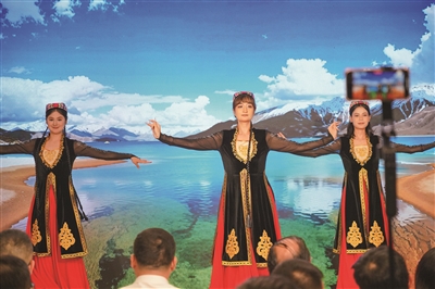 来自新疆阿克苏地区的表演者跳民族舞蹈