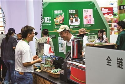 观众在第三届链博会健康生活展区星巴克展台前了解产品
