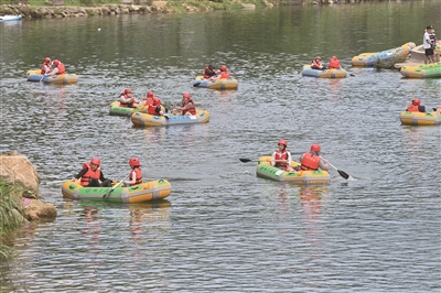 7月20日,游客在广西柳州市融水县香粉乡雨卜村漂流消暑。盛夏时节,融水县各地清澈凉爽的瀑布、潭水、溪流吸引各地游客前来畅享夏日清凉,当地暑期旅游逐渐进入旺季,乡村“夏日经济”火热。