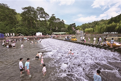 7月18日,游客在福建东北部的周宁县泗桥乡溪口村戏水度夏。周宁县森林覆盖率72.96%,平均海拔880米,夏季日平均气温仅为24℃,被誉为“云端之城”。近年来,周宁县依托得天独厚的生态优势和丰富的文旅资源,着力发展文旅研学、旅居康养等暑期经济,每年吸引超20万人次前来消暑度夏。