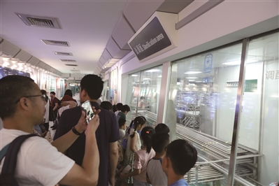 参观走廊内还摆放了一个“奶牛陈列柜”,在柜中集纳了世界上不同地区的24头形态迥异的奶牛模型,生动且趣味十足。沿着参观走廊一路往下,消费者可以看到杀菌机、成品槽、果肉蒸煮室、包装区、充填区等生产环节。正压充填区那些闪着银光的巨大槽罐吸引了大家的目光。导览员说,设备在灌装乳品时对清洁程度要求是非常严格的。整个房间要达到万级的清洁程度,而充填机内更是达到百万级的大清洁程度。在这里流水线不停往杯柱上加空杯,杯子自动下槽,设备对杯子进行异物去除和紫外灯照射杀菌后,才会通过传送带到达奶缸,进行充填,最后封膜。