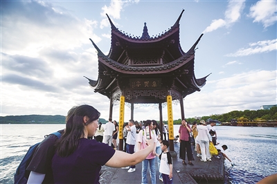近日,杭州受到高空到低空一致的东南气流影响,天空云量很多,持续上演西湖蓝天气。湛蓝的天空,白云朵朵,空气干净,能见度特别好。图为昨天游客在西湖边游玩拍照。 商报记者 项凯 摄影报道