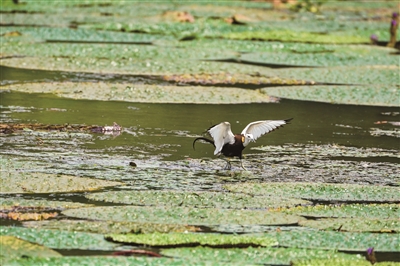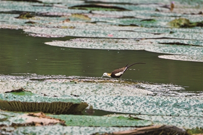 近日,西溪国家湿地公园莲花滩观鸟区水域内,几只黑褐白三色羽毛相间的水雉,成了全国各地鸟友争相前来打卡的“网红”。据悉,今年来了5只水雉,一雌四雄。水雉是国家二级重点保护野生动物,是一种典型的湿地夏候鸟,因其体态优美、长尾飘逸,故有“水凤凰”的美称。