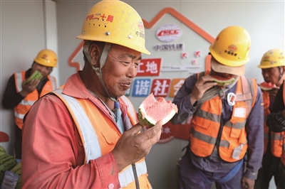 7月23日,在甘肃省武威市古浪县的中铁二十局一处项目工地上,一线劳动者利用工作间隙在“休闲清凉驿站”里吃西瓜。 近期,甘肃多地晴热高温,中铁二十局在甘肃省内多个项目工地上设立“休闲清凉驿站”,发放防暑降温物资、药品,开展中暑急救、高温防护等培训,为坚守岗位的一线劳动者撑起“清凉绿荫”。