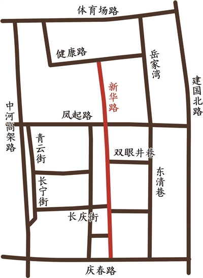 新华路南起庆春路,北至健康路。清代时,道路由南至北分别为忠清巷、福圣庵巷、昇平街。