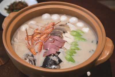 “鱼头是一定要菜籽油加猪油煎过,煎透了再开水下去跑,把汤跑浓才行。”王容卿说。八卦鱼头上桌,趁热就要先来一碗汤,这时候的鱼汤,浓白如乳,鲜而不腻,鱼头的醇厚鲜味都已经熬进汤里,搭配竹荪来一口,脆甜咸鲜。然后再开火,慢慢吃鱼圆、鱼肉,美。