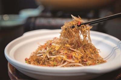 更有特色的是一道海鲜干捞粉丝。“泡这个粉丝的温度和时间都得控制好。”王容卿说。粉丝捞出来的时候条条分明,吸饱了水分却又不失筋道。铁锅烧得冒烟,倒油滑锅,倒入蛋液,锅勺快速搅散,瞬间炒成金黄的桂花状。紧接着,粉丝入锅,这时候,考验厨师眼力和经验的时候到了,温度高了,要及时离火,低了,要放回灶上,勺子要翻得勤,才能让料和粉丝充分缠裹。