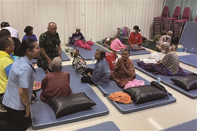 右图:7月25日,在泰国乌汶府一处避难所,被疏散的当地居民与工作人员交流。 新华社发