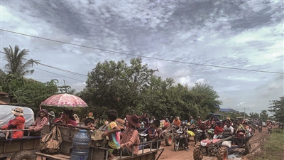上图:7月24日,柬埔寨奥多棉吉省边境地区的民众正在撤离。 新华社发