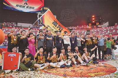 昨晚,在拱墅区运河体育中心体育馆举行的“浙BA”杭州赛区冠亚军的对决中,富阳队以89:61的比分战胜上城队,赢得杭州赛区冠军!这是富阳队在赛后合影。商报记者 项凯 摄影报道