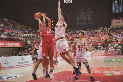 比赛进行到第四节,这边富阳队许泽伟投中3分球后,上城队陈洋立刻以同样的3分球回敬,球员们精彩的表现瞬间燃爆球迷们的热情。