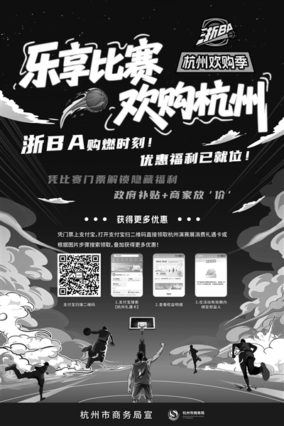 为更好地吸引外来消费,在省级联赛比赛日当天,将通过“浙BA”杭州礼遇卡现场发放两万个50元的观赛红包,联动区县发放商超、文旅、体育各类消费券超5000万元。杭州各类商业活动现场设置超1000个联播屏,转播或直播比赛。