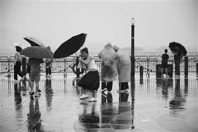 昨天下午,西湖边游客在大雨中顶风行走。