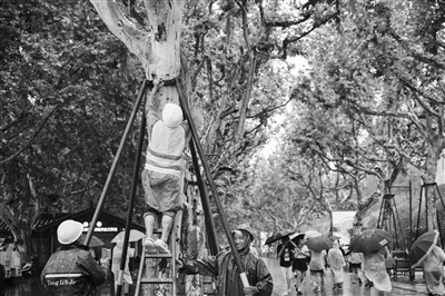 昨天下午,西湖边的工人在为树木加固。