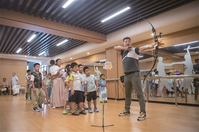 7月31日,山城重庆市两江新区大竹林街道竹林社区学院举行文化艺术游园会活动,吸引近百名在临近社区居住的小朋友和家长参加。这是工作人员尹占旭(右一)向小朋友展示射箭技巧。