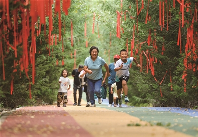 7月28日,游客在新疆塔城地区乌苏佛山国家森林公园消暑观光。连日来,新疆多地持续高温,不少市民和游客选择前往天山深处的景区乘凉避暑。乌苏市境内草原、沙漠胡杨、湖泊、原始森林等自然资源丰富,吸引众多游客前来消暑度假。