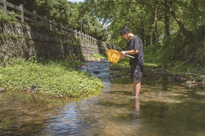 “今天我来到杭州周边的一条小溪,一下水就发现了一窝小石板鱼。满满一网兜,多可爱。欣赏完了吗,那把它们放回河流中吧。”