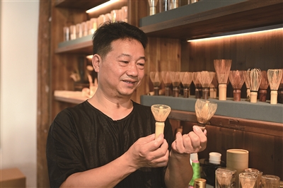 8月5日,在杭州市余杭区径山村,非遗传承人陈金信展示手工制作的茶筅。近年来,径山村大力发展“茶旅融合”新业态,打造数字茶园、低碳民宿和非遗茶筅制作工作室等特色项目,将生态优势转化为发展优势,生动践行“绿水青山就是金山银山”理念。