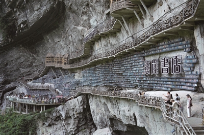 8月9日,游客在广西河池市罗城仫佬族自治县棉花天坑景区内的悬崖书店游玩。罗城棉花天坑景区的悬崖书店于2025年5月开业,以其独特的建筑设计与阅读体验吸引众多游客和读者,累计接待游客10万人次。