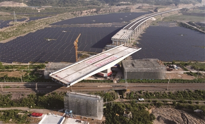 当日,由中铁大桥局承建的河南省济源市沿太行山高速公路上跨焦(作)柳(州)铁路立交桥成功转体。转体主梁总长130米,总重量达2.1万吨。