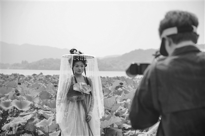 副高控场,晴热高温成了这几天的“主旋律”。昨天,游客穿着汉服在西湖边拍照。 摄影 商报记者 项凯