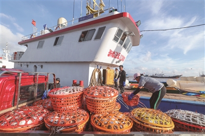 8月12日,开渔归来的渔运船靠泊在舟山沈家门舟山国际水产城码头,渔民把整筐的梭子蟹运送上岸装车。 近日,东海部分海域结束为期3个月的伏季休渔期,浙江舟山市申请了专项捕捞特许的渔船结束休渔,开赴东海海域进行捕捞作业。渔运船和渔船一同抵达作业渔场,捕捞上来的海产品由渔运船先行送回港口码头,渔船则留在海上继续生产。 舟山沈家门渔港舟山国际水产城的商户们迎来了忙碌的时节,近期每天约有2000吨梭子蟹到港,经过分拣、绑扎后发往各地市场。 新华社发
