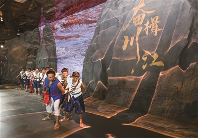 8月15日,位于重庆市江北区的川江航运文化园正式开园。川江航运文化园以“民生机器厂旧址”为基础,占地面积10万平方米,以“激流江舟”为主题,通过山城步道串联室内展览、室外公园、地下防空洞,将川江之险绝、航运之发展融入建筑设计,打造城市中的“立体川江”。这是演员在川江航运文化园开园仪式上表演歌舞《川江号子》。