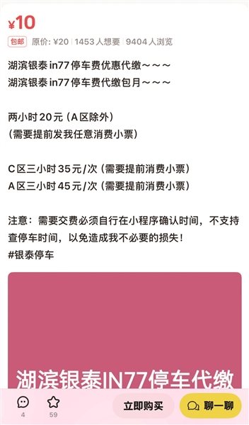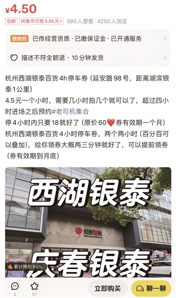 也有人选择求助二手平台,通过平台上的停车费代缴服务来省钱。例如,在闲鱼平台上,湖滨银泰in77除A区外的代缴费价格为两小时20元(需提供任意消费小票),原价为15元/小时;西湖银泰百货代缴费价格为4.5元/小时,4小时内18元,原价为15元/小时。