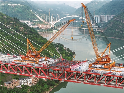 8月20日,位于云南省昭通市绥江县和四川省宜宾市屏山县交界处的新市金沙江特大桥正式合龙。大桥总长1867米,主跨680米,主塔总高度297.51米,属于双塔双索面钢桁梁斜拉桥。建成通车后将对于畅通川滇两地交通、推动经济社会发展意义重大。这是工人在吊装合龙段桁梁(无人机照片)。