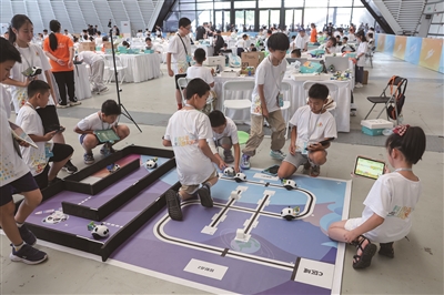 8月19至24日,2025全国青少年信息素养大赛总决赛在嘉兴桐乡市举行,来自全国各地的2.8万余名选手,在智能应用、算法思维、自主创新三大领域的20个赛项中展开角逐。这是20日选手们在参加“智能星际”挑战赛。