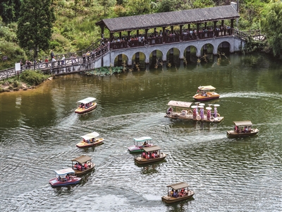 8月21日,游客在重庆市石柱县黄水镇月亮湖景区泛舟游玩(无人机照片)。黄水镇平均海拔1550.14米,夏季平均气温19.9℃,被誉为“天然森林氧吧”,是国家级森林公园。今年以来黄水镇接待游客1600万人次,实现旅游综合收入112亿元。
