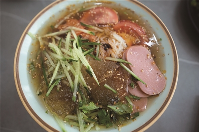 除了硬菜,夏天来碗冷面才够过瘾。冷面都是从东北直发的,典型的酸甜口,冰凉筋道,配着烧烤吃特解腻。杭州夏天热,这口凉丝丝的正好。