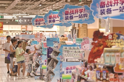 8月24日,在浙江省嘉兴市南湖区一家商场,家长带着孩子选购学习用品