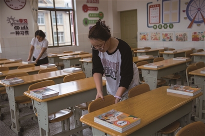 8月24日,教职工在云南省曲靖市沾益区望海小学分发教材