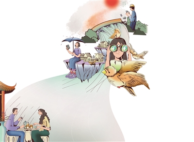 沈秋走走停停,循着鸟鸣举起望远镜。远处芦苇尖上,一只东方大苇莺正栖息着——“这是它的习性”;转身又见家燕,“就是‘小燕子 穿花衣’歌词里的小燕子”;北苕溪水岸边,一只牛背鹭静立,“白色的鹭有好几种,它也是其中之一,总跟着牛群讨饭吃,牛蹄翻起的虫儿就是现成的点心”。“北湖的鸟爱躲,芦苇是隐身斗篷、草丛是屏风,但观鸟人会分享踪迹,把数据传上公开平台,引着‘长枪大炮’来打卡。”她说。