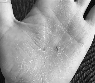 “技工手”是一个特征性的临床体征。它指的是患者手指侧面(尤其是食指和中指)和掌面出现过度角化、粗糙、脱屑、发红、出现裂口(皲裂)或色素沉着的现象,看上去就像机械工人、木匠师傅因长期摩擦劳作造成手部干燥粗糙。这种“粗糙”与我们平常的皮肤干燥不同,它通常有特定位置,主要在手指侧面和指尖;会反复出现迁延不愈,不易通过涂抹护手霜彻底缓解;患者通常没有明显的不适感,因此极易被忽视。