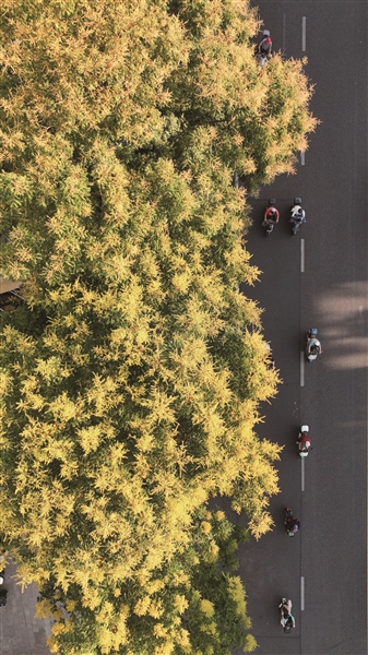 眼下,杭城很多地方的栾树黄了。在著名的栾树聚集地——凯旋路,400多棵黄山栾树,枝头纷纷开出了金黄色的小碎花,还有一些心急的树已经结出橙红色的蒴果。从空中俯瞰,仿佛一幅美丽油画,让人瞬间拥有美好心情。 商报记者 项凯 摄影报道