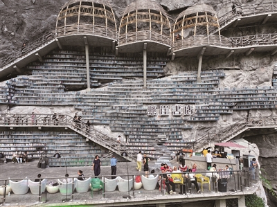 8月30日,游客在广西河池市罗城仫佬族自治县悬崖书店游玩(无人机照片)。秋日里,人们走出家门,亲近自然,乐享好时光。