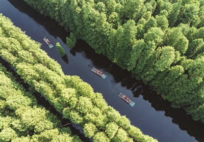 8月30日,游人在江苏省淮安市金湖县水上森林景区乘坐竹筏游览美景(无人机照片)。该水上森林景区既是4A级旅游景区,也是省级水利风景区,占地1.2万亩,有“天然氧吧”之美誉,是华东地区首个集休闲度假、温泉养生、森林探险等功能于一体的大型森林旅游综合体。