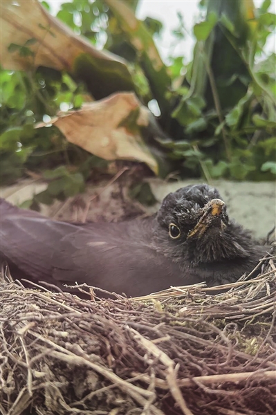 “出生第三天,雏鸟身上有了一层黑色的绒毛。第七天,羽管长出来了。两周后,已经长得和成鸟差不多大,羽翼丰满了。”小乌鸫长大速度之快,着实让吴女士惊讶,堪称“速生鸟”。