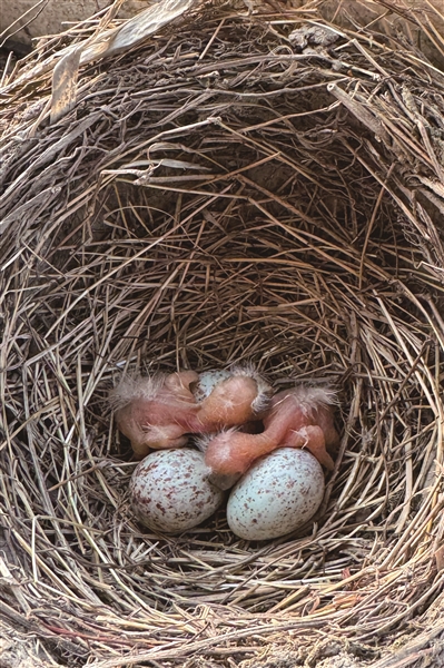 “鸟巢不大,圆圆的,由枯树枝、草秆、苔藓组成。里面躺着3个小小的鸟蛋,样子很像菜市场卖的鹌鹑蛋。”