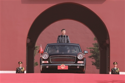 9月3日,纪念中国人民抗日战争暨世界反法西斯战争胜利80周年大会在北京天安门广场隆重举行。中共中央总书记、国家主席、中央军委主席习近平发表重要讲话并检阅受阅部队。这是习近平乘检阅车,经过金水桥,驶上长安街。 新华社发